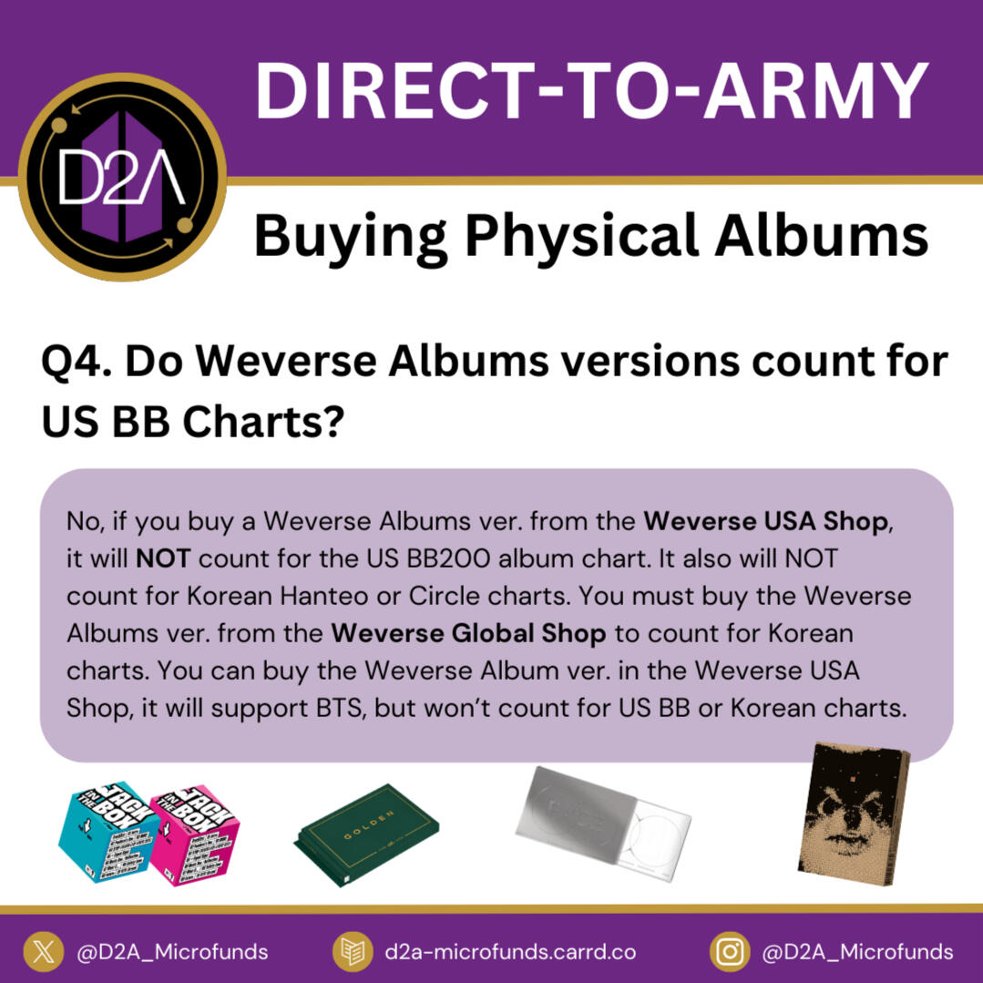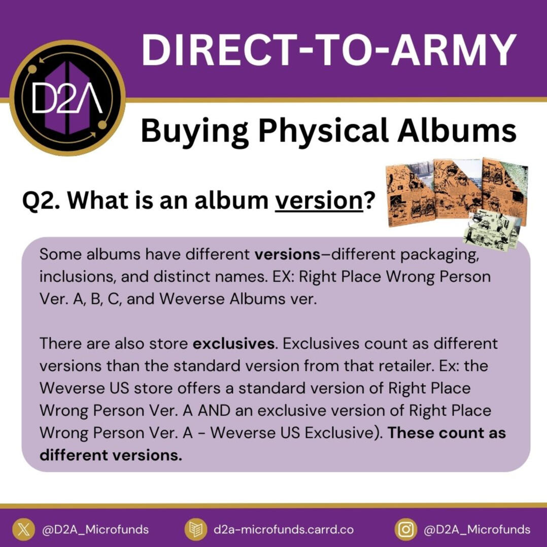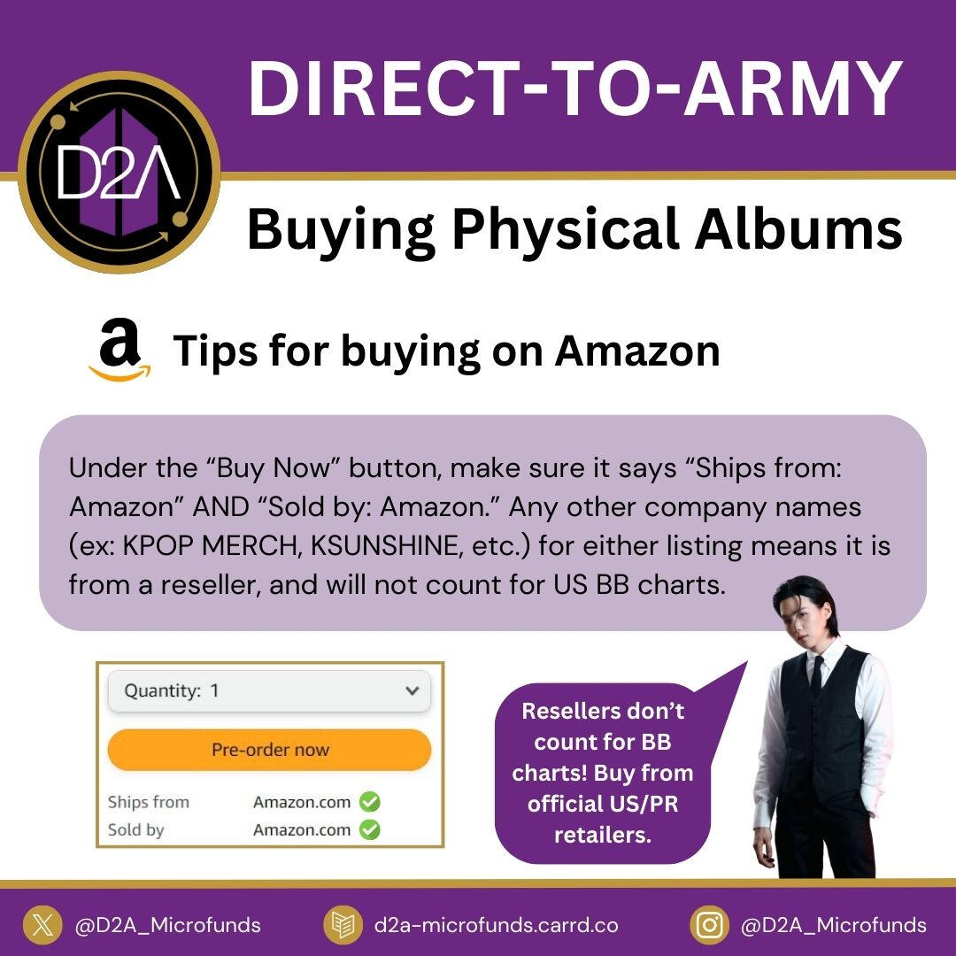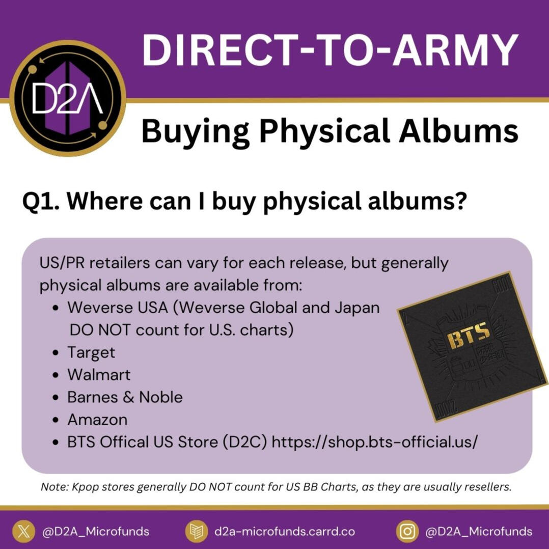 D2A, or Direct-to-ARMY, is a micro-funding fanbase founded in 2021 for US/PR ARMY. We help ARMY buy BTS digital music on platforms like iTunes, Amazon, Qobuz, and the BTS Official Store.We also provide Buyer Education to help ARMY buy across all available platforms.
