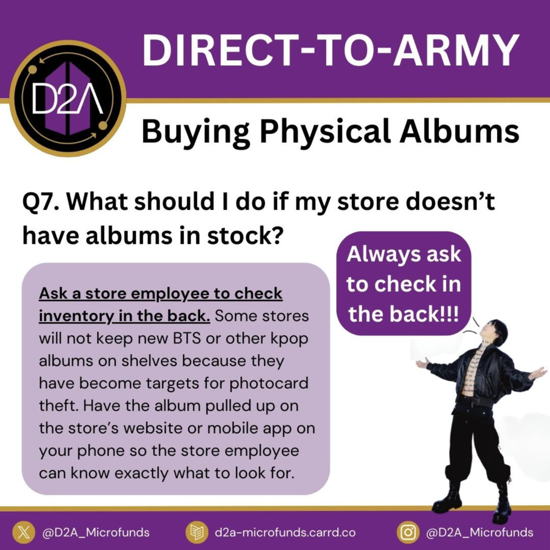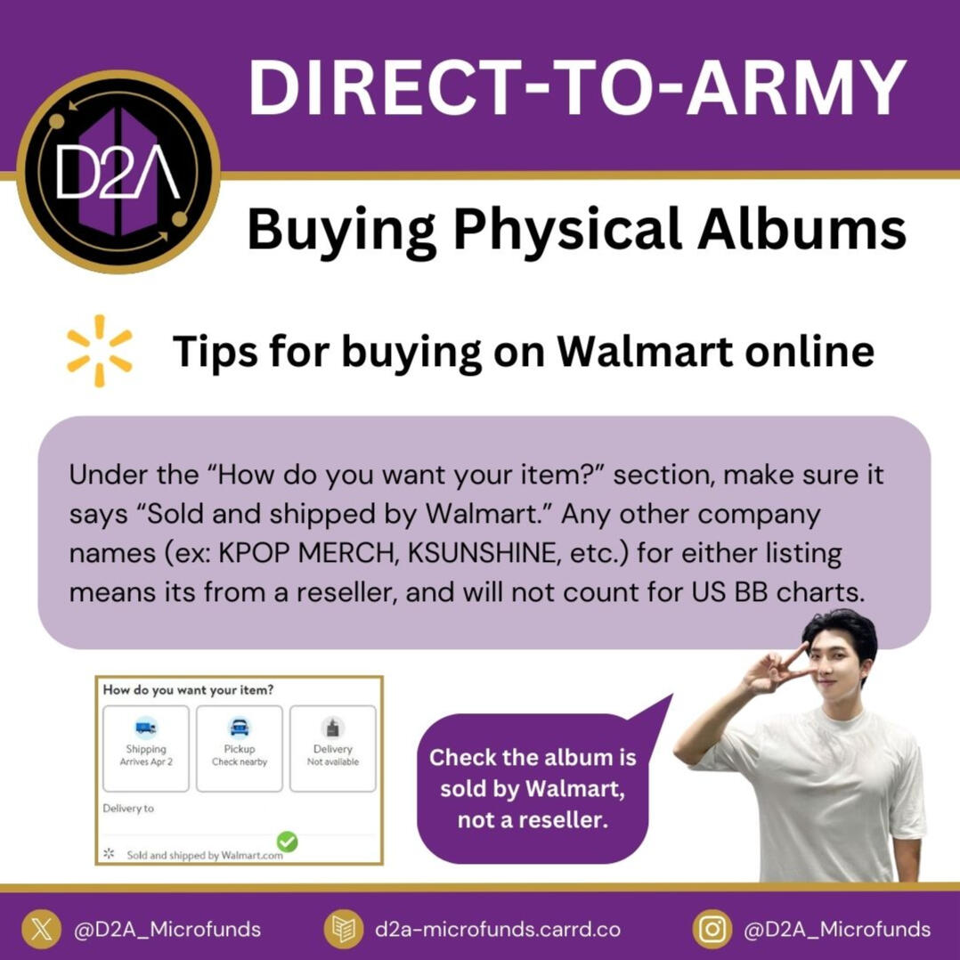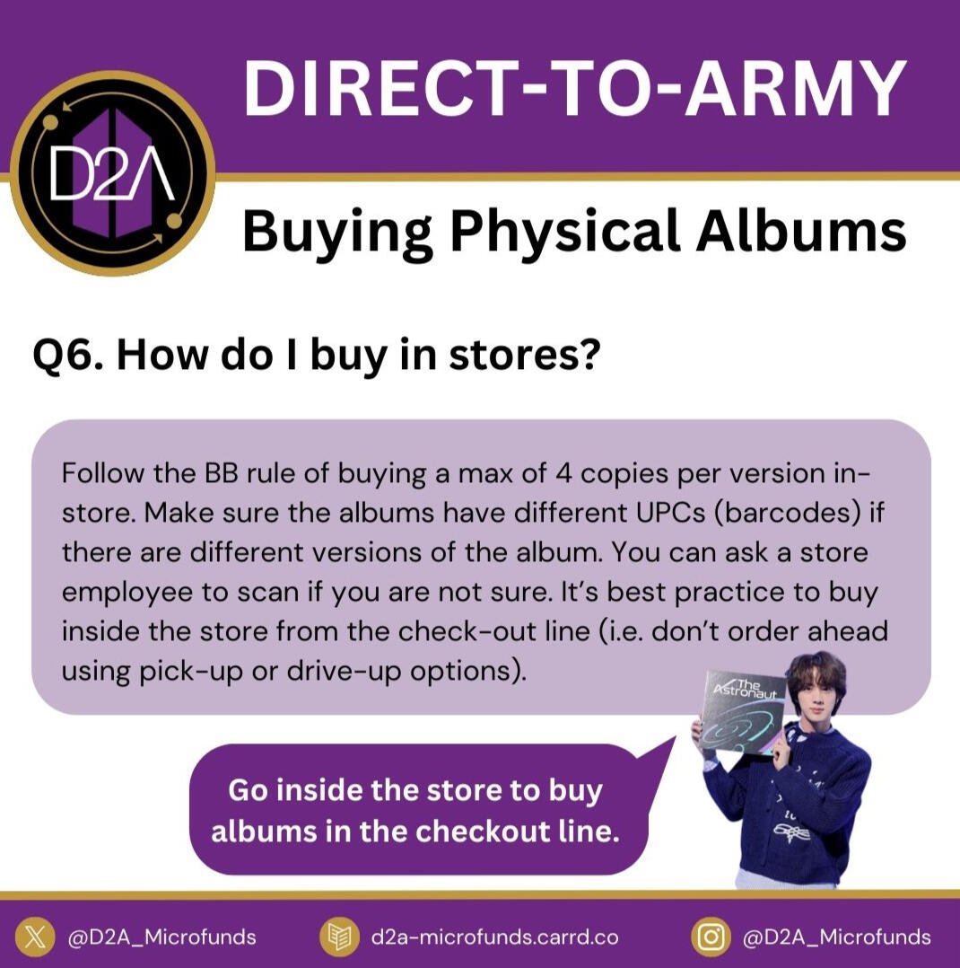 D2A, or Direct-to-ARMY, is a micro-funding fanbase founded in 2021 for US/PR ARMY. We help ARMY buy BTS digital music on platforms like iTunes, Amazon, Qobuz, and the BTS Official Store.We also provide Buyer Education to help ARMY buy across all available platforms.