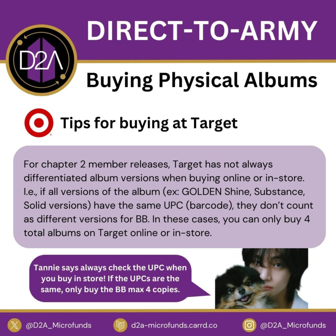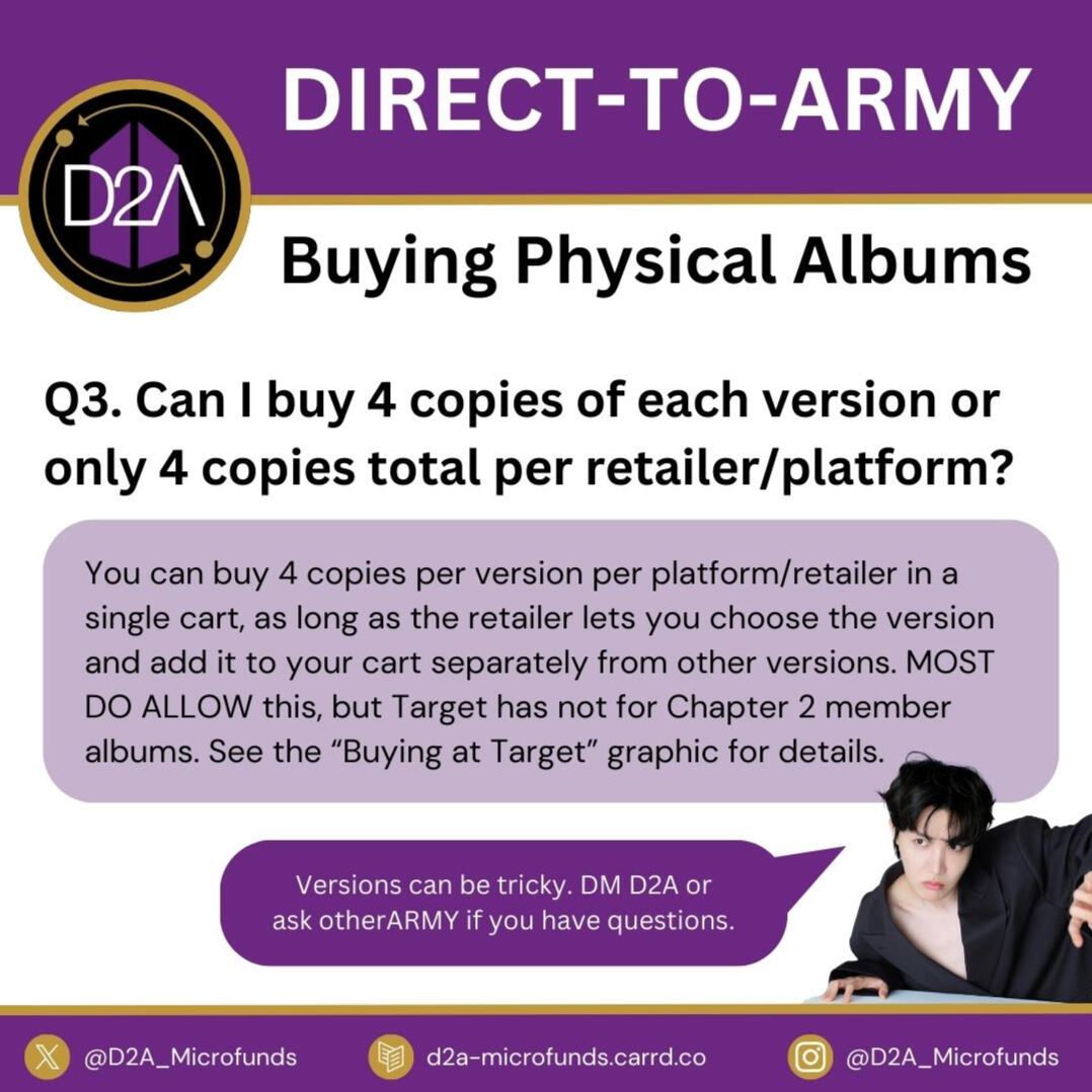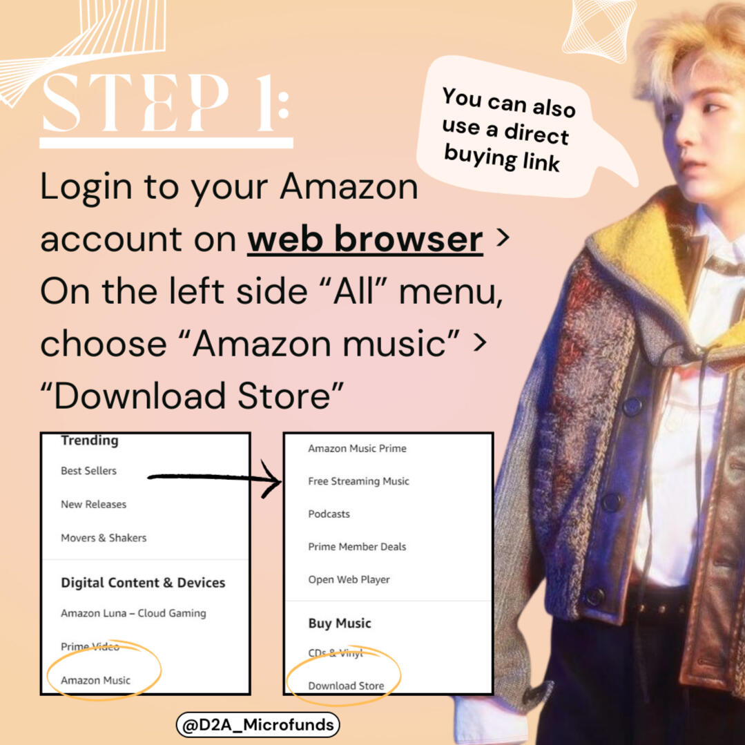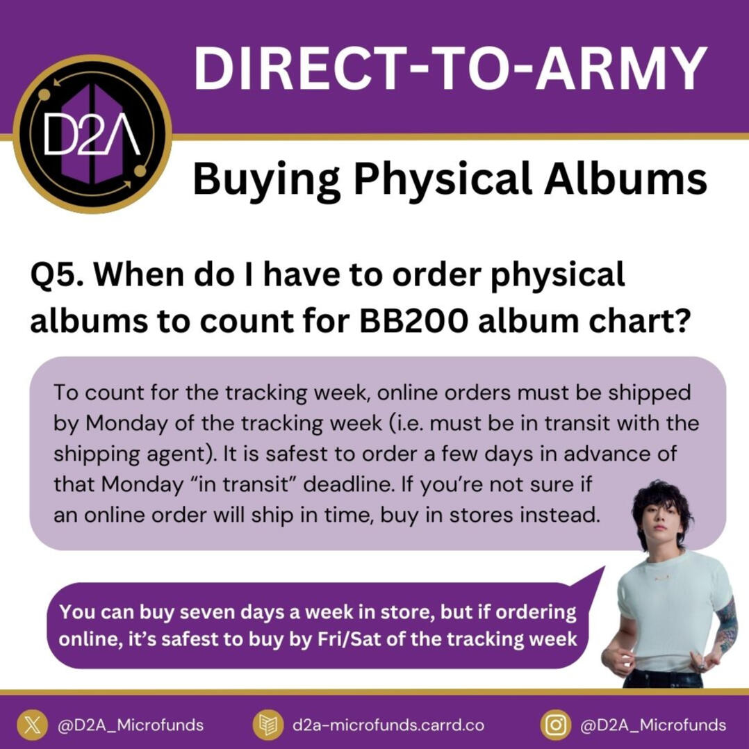 D2A, or Direct-to-ARMY, is a micro-funding fanbase founded in 2021 for US/PR ARMY. We help ARMY buy BTS digital music on platforms like iTunes, Amazon, Qobuz, and the BTS Official Store.We also provide Buyer Education to help ARMY buy across all available platforms.